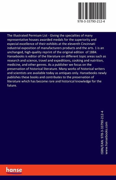 The Illustrated Permium List - Giving the specialties of many representative houses awarded medals for the superiority and especial excellence of their exhibits at the eleventh Cincinnati industrial exposition of manufacturers products and the arts. 1 is an unchanged, high-quality reprint of the original edition of 1884. Hansebooks is editor of the literature on different topic areas such as research and science, travel and expeditions, cooking and nutrition, medicine, and other genres. As a publisher we focus on the preservation of historical literature. Many works of historical writers and scientists are available today as antiques only. Hansebooks newly publishes these books and contributes to the preservation of literature which has become rare and historical knowledge for the future.