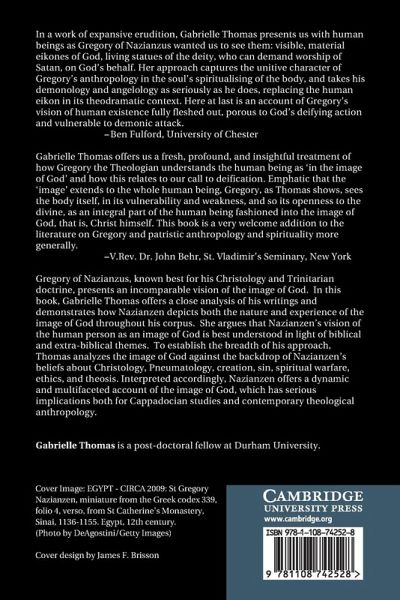 Gregory of Nazianzus, known best for his Christology and Trinitarian doctrine, presents an incomparable vision of the image of God. In this book, Gabrielle Thomas offers a close analysis of his writings and demonstrates how Nazianzen depicts both the nature and experience of the image of God throughout his corpus. She argues that Nazianzen's vision of the human person as an image of God is best understood in light of biblical and extra-biblical themes. To establish the breadth of his approach, Thomas analyzes the image of God against the backdrop of Nazianzen's beliefs about Christology, Pneumatology, creation, sin, spiritual warfare, ethics, and theosis. Interpreted accordingly, Nazianzen offers a dynamic and multifaceted account of the image of God, which has serious implications both for Cappadocian studies and contemporary theological anthropology.