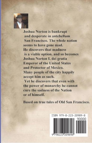 Sometimes the only path to sanity is through madness. San Francisco, 1859. Joshua Norton, desperate to survive, sees madness overtaking America. He has lost his fortune and believes the country is losing its mind. In a flash of insight, he finds the answer to both problems. He will become Emperor of the United States and Protector of Mexico. He will issue proclamations to make things right. Now imagine young Marina. She wants only to sing. Because she allows Joshua into her theater she allows him into her life. Soon she is caught up into the madness of Civil War, a conflict making no sense. In a world turned upside down, the insanity of Emperor Norton becomes her only anchor to Reason. And in defiance of death, there is new life. Enjoy the book and travel to a time past, which haunts us yet today.