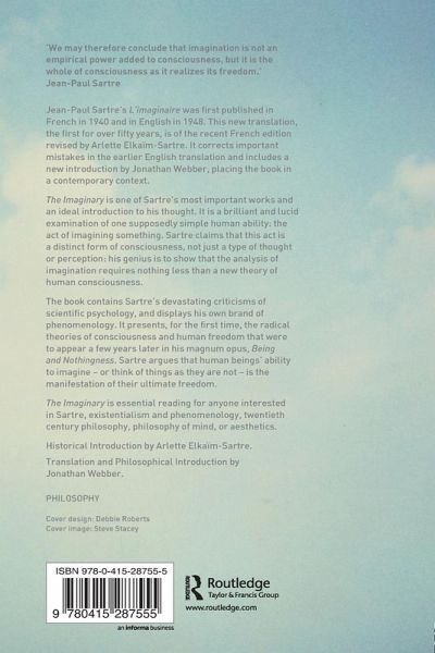 First published in 1940, Sartre's The Imaginary is a cornerstone of his philosophy. Sartre had become acquainted with the philosophy of Edmund Husserl in Berlin and was fascinated by his idea of the intentionality of consciousness as a key to the puzzle of existence. Against this background, The Imaginary crystallized Sartre's worldview and artistic vision. Here he presented the first extended examination of the concepts of nothingness and freedom, both of which are derived from the ability of consciousness to imagine objects both as they are and as they are not. These ideas would drive Sartre's existentialism and his entire theory of human freedom, laying the foundation for his masterwork Being and Nothingness three years later. This new translation by Jonathan Webber rectifies flaws in the terminology of the first translation and recaptures the essence of Sartre's phenomenology. Webber's perceptive new introduction helps to decipher this challenging, seminal work, placing it in the context of the author's work and the history of philosophy.