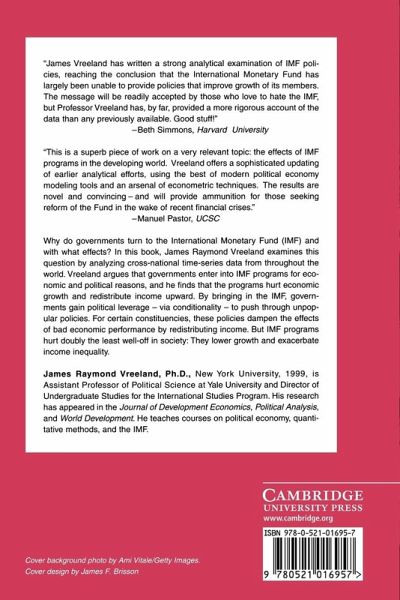 Why do governments turn to the International Monetary Fund (IMF) and with what effects? In this book, James Vreeland examines this question by analyzing cross-national time-series data from throughout the world. Vreeland argues that governments enter into IMF programs for economic and political reasons, and he finds that the programs hurt economic growth and redistribute income upward. By bringing in the IMF, governments gain political leverage - via conditionality - to push through unpopular policies. For certain constituencies, these policies dampen the effects of bad economic performance by redistributing income. But IMF programs doubly hurt others who are less well off: They lower growth and exacerbate income inequality.