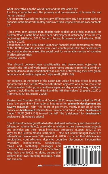 What imperatives do the World Bank and the IMF abide by? Are they compatible with the primacy and pre-eminence of human life and human beings? Are the Bretton Woods institutions any different from any high street banks or financial institutions? Ultimately, whom are their respective boards accountable to? It has even been alleged that, despite their explicit and official mandate, the Bretton Woods institutions have been "development-unfriendly" from the very beginnings (Helleiner, 2015; Romero, Perera, Brunswijck and Saldanha, 2019; Cepeda, 2021). Simultaneously, 'the 1997 South East Asian financial crisis demonstrated, many of the Bretton Woods policies were even counterproductive for development and considerably increased the social cost for vulnerable sectors of societies in affected countries' (Cepeda, 2021). "The discord between loan conditionality and development objectives is rooted in the IMF and World Bank's governance structure permitting dominant shareholders to utilize conditionality as a means of furthering their own global economic and political agendas," says Wolff (2013:106). For instance, at the height of the South East Asian financial crisis, it became apparent that the Bretton Woods institutions' 'objective was not to rescue the Thai population but impose a neoliberal agenda and guarantee foreign creditors' payment, including the World Bank and the IMF themselves'. (Cepeda, 2021) or (Romero, 2020; Toussaint, 2020b) Masters and Chatzky (2019) and Cepeda (2021) respectively called the World Bank "the preeminent international institution for economic development and poverty reduction"; with "the board of governors, mostly made up of senior finance or development officials from member countries"; and a "development funder". Wolff (2013:133) termed the IMF "the 'gatekeeper' for development assistance". [Emphasis added] It could therefore be argued that what has hallmarks of secrecy and obscurantism (alleged or substantiated); especially in relation to their development projects and activities and their "great intellectual arrogance" (Lopes, 2012:72) are ways for the Bretton Woods institutions - "the self-styled thought-leaders of international development" (Romero et al., 2019) - to occult their deficiencies, ambiguities, contradictions, duplicity, cognitive dissonance, incongruities, hypocrisy, incoherencies, weaknesses, mixed and conflicting messages and methods, failures and inability to effectively keep their promise(s); let alone, pursue and achieve their own founding mandate, vision and mission.