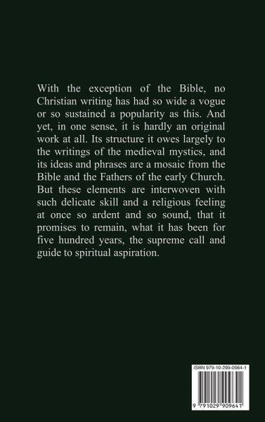 With the exception of the Bible, no Christian writing has had so wide a vogue or so sustained a popularity as this. And yet, in one sense, it is hardly an original work at all. Its structure it owes largely to the writings of the medieval mystics, and its ideas and phrases are a mosaic from the Bible and the Fathers of the early Church. But these elements are interwoven with such delicate skill and a religious feeling at once so ardent and so sound, that it promises to remain, what it has been for five hundred years, the supreme call and guide to spiritual aspiration.