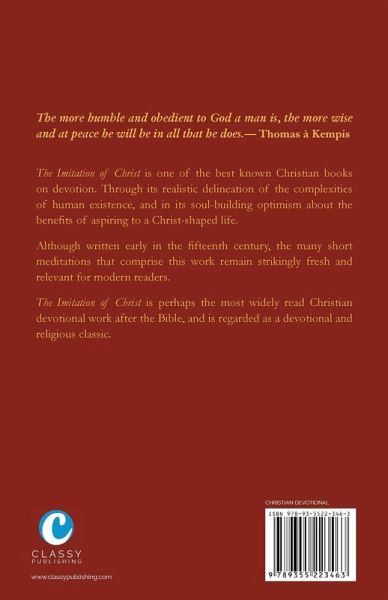 The more humble and obedient to God a man is, the more wise and at peace he will be in all that he does.- Thomas à Kempis The Imitation of Christ is one of the best known Christian books on devotion. Through its realistic delineation of the complexities of human existence, and in its soul-building optimism about the benefits of aspiring to a Christ-shaped life. Although written early in the fifteenth century, the many short meditations that comprise this work remain strikingly fresh and relevant for modern readers. The Imitation of Christ is perhaps the most widely read Christian devotional work after the Bible, and is regarded as a devotional and religious classic.