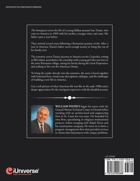 The Immigrant covers the life of a young Balkan peasant boy, Traian, who came to America in 1909 with his mother, younger sister, and aunt. His father came a year before. They arrived several years following a Romanian peasant revolt. After a year in America, Traian's father saved enough money to bring the rest of his family over. The narrative covers Traian's journey to America on the Carpathia, vetting at Ellis Island, assimilation, his courtship with a young girl who was born in the same Romanian village, raising his family during the Great Depression, and seeking to live out the American Dream. To bring the reader directly into the narrative, the story is laced together with historical facts, visual scene descriptions, dialogue, and the challenges of building a new life in America. Get a rich picture of what American life was like in the early 1900s and a deeper appreciation for the immigrant experience with this detailed account.