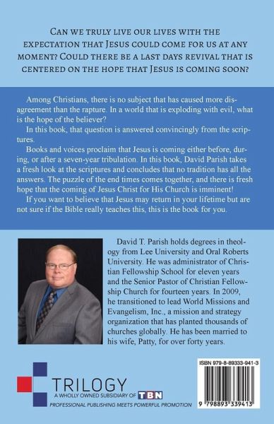 Can we truly live our lives with the expectation that Jesus could come for us at any moment? Could there be a last days revival that is centered on the hope that Jesus is coming soon? Among Christians, there is no subject that has caused more disagreement than the rapture. In a world that is exploding with evil, what is the hope of the believer? In this book, that question is answered convincingly from the scriptures. Books and voices proclaim that Jesus is coming either before, during, or after a seven-year tribulation. In this book, David Parish takes a fresh look at the scriptures and concludes that no tradition has all the answers. The puzzle of the end times comes together, and there is fresh hope that the coming of Jesus Christ for His Church is imminent! If you want to believe that Jesus may return in your lifetime but are not sure if the Bible really teaches this, this is the book for you.
