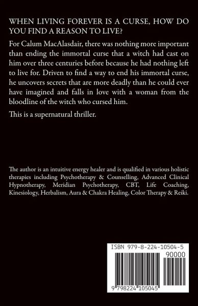 When living forever is a curse, how do you find a reason to live? For Calum MacAlasdair, there was nothing more important than ending the immortal curse that a witch had cast on him over three centuries before because he had nothing left to live for. Driven to find a way to end his immortal curse, he uncovers secrets that are more deadly than he could ever have imagined and falls in love with a woman from the bloodline of the witch who cursed him. This is a supernatural romance thriller.