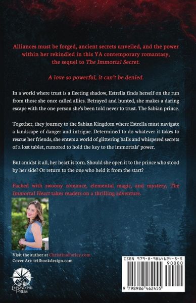 Alliances must be forged, ancient secrets unveiled, and the power within her rekindled in this YA contemporary romantasy, the sequel to The Immortal Secret. A love so powerful, it can't be denied. In a world where trust is a fleeting shadow, Estrella finds herself on the run from those she once called allies. Betrayed and hunted, she makes a daring escape with the one person she's been told never to trust. The Sabian prince. Together, they journey to the Sabian Kingdom where Estrella must navigate a landscape of danger and intrigue. Determined to do whatever it takes to rescue her friends, she enters a world of glittering balls and whispered secrets of a lost tablet, rumored to hold the key to the immortals' power. But amidst it all, her heart is torn. Should she open it to the prince who stood by her side? Or return to the one who held it from the start? Packed with swoony romance, elemental magic, and mystery, The Immortal Hearttakes readers on a thrilling adventure.