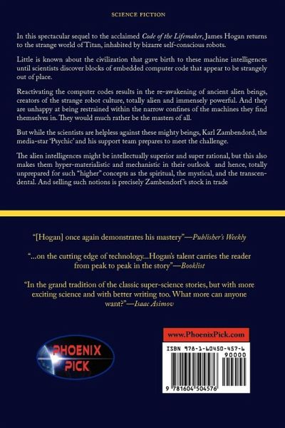"[Hogan] once again demonstrates his mastery"-Publisher's Weekly **** "...on the cutting edge of technology...Hogan's talent carries the reader from peak to peak in the story"-Booklist **** "In the grand tradition of the classic super-science stories, but with more exciting science and with better writing too. What more can anyone want?"-Isaac Asimov **** In this spectacular sequel to the acclaimed Code of the Lifemaker, James Hogan returns to the strange world of Titan, inhabited by bizarre self-conscious robots. **** Little is known about the civilization that gave birth to these machine intelligences until scientists discover blocks of embedded computer code that appear to be strangely out of place. **** Reactivating the computer codes results in the re-awakening of ancient alien beings, creators of the strange robot culture, totally alien and immensely powerful. And they are unhappy at being restrained within the narrow confines of the machines they find themselves in. They would much rather be the masters of all. **** But while the scientists are helpless against these mighty beings, Karl Zambendord, the media-star 'Psychic' and his support team prepares to meet the challenge. **** The alien intelligences might be intellectually superior and super rational, but this also makes them hyper-materialistic and mechanistic in their outlook and hence, totally unprepared for such "higher" concepts as the spiritual, the mystical, and the transcendental. And selling such notions is precisely Zambendorf's stock in trade