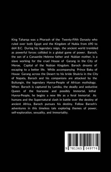 King Taharqa was a Pharaoh of the Twenty-Fifth Dynasty who ruled over both Egypt and the Kingdom of Nubia from 690 to 664 B.C. During his legendary reign, the ancient world trembled as powerful forces collided in a global game of power. Baroch, the son of a Canaanite Hebrew father and Nubian mother, is a slave working for the cruel House of Garang in the City of Meroe, Capital of the Nubian Kingdom. Baroch dreams of escaping to a better life. While accompanying Prince Baku of House Garang across the Desert to his bride Shukria in the City of Napata, Baroch and his companions are attacked by the Bultungin, the legendary Hyena-People of African Mythology. When Baroch is captured by Lamika, the deadly and seductive Queen of the fearsome and possibly Immortal, lethal Hyena-People, he begins a new life as a feral Immortal. As humans and the Supernatural clash in battle over the destiny of ancient Africa, Baroch pursues his destiny. Follow Baroch's adventures in this timeless tale exploring themes of power, self-exploration, sexuality, and Immortality.