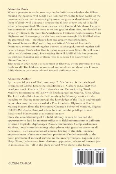 About the Book When a promise is made, one may be doubtful as to whether the fellow making the promise will fulfill it or not; but when the fellow backs up the promise with an oath - swearing by someone greater than himself, every form of doubt will disappear because the fellow is now bound to fulfill what he has promised. This was the case with God and Abraham. He gave him a promise, and since there is no one greater than Him, He decided to swear by Himself. He put His Almightiness, Holiness, Righteousness, Most Highness and Sovereignty on the line; and sure enough, He fulfilled what He promised him - He blessed him and greatly multiplied him. The word 'immutability' according to Oxford Advanced Learner's Dictionary means something that cannot be changed, something that will never change. That's what God is trying to get across. Since He will never tell a lie (Numbers 23:19), He is saying He will fulfill all He has promised us, without changing any of them. This is because He had sworn by Himself to do so. This book in your hand is a collection of fifty (50) of the promises He had made to all His children; as you read and meditate on them, ask Him to fulfill them in your own life and He will definitely do so.