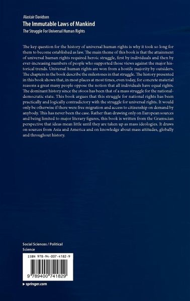 The key question for the history of universal human rights is why it took so long for them to become established as law. The main theme of this book is that the attainment of universal human rights required heroic struggle, first by individuals and then by ever-increasing numbers of people who supported those views against the major historical trends. Universal human rights are won from a hostile majority by outsiders. The chapters in the book describe the milestones in that struggle. The history presented in this book shows that, in most places at most times, even today, for concrete material reasons a great many people oppose the notion that all individuals have equal rights. The dominant history since the 1600s has been that of a mass struggle for the national-democratic state. This book argues that this struggle for national rights has been practically and logically contradictory with the struggle for universal rights. It would only be otherwise if there were free migration and access to citizenship on demand by anybody. This has never been the case. Rather than drawing only on European sources and being limited to major literary figures, this book is written from the Gramscian perspective that ideas mean little until they are taken up as mass ideologies. It draws on sources from Asia and America and on knowledge about mass attitudes, globally and throughout history.