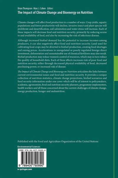 The Impact of Climate Change and Bioenergy on Nutrition articulates the links between current environmental issues and food and nutrition security. It provides a unique collection of nutrition statistics, climate change projections, biofuel scenarios and food security information under one cover which will be of interest to policymakers, academia, agronomists, food and nutrition security planners, programme implementers, health workers and all those concerned about the current challenges of climate change, energy production, hunger and malnutrition.