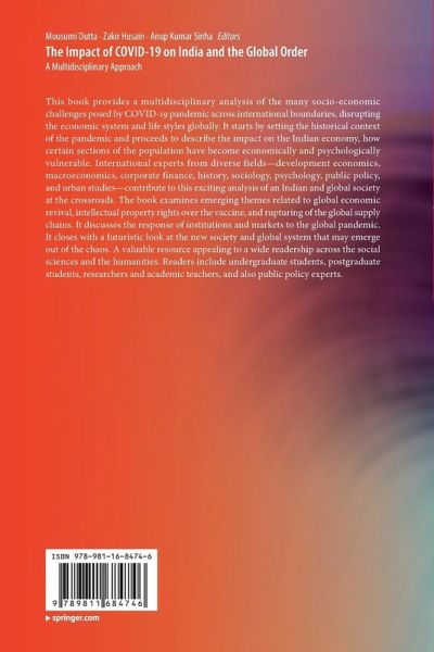 This book provides a multidisciplinary analysis of the many socio-economic challenges posed by COVID-19 pandemic across international boundaries, disrupting the economic system and life styles globally. It starts by setting the historical context of the pandemic and proceeds to describe the impact on the Indian economy, how certain sections of the population have become economically and psychologically vulnerable. International experts from diverse fields-development economics, macroeconomics, corporate finance, history, sociology, psychology, public policy, and urban studies-contribute to this exciting analysis of an Indian and global society at the crossroads. The book examines emerging themes related to global economic revival, intellectual property rights over the vaccine, and rupturing of the global supply chains. It discusses the response of institutions and markets to the global pandemic. It closes with a futuristic look at the new society and global system that may emerge out of the chaos. A valuable resource appealing to a wide readership across the social sciences and the humanities. Readers include undergraduate students, postgraduate students, researchers and academic teachers, and also public policy experts.