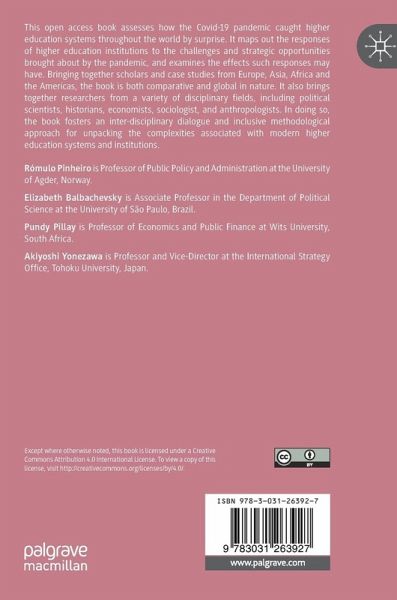 This open access book assesses how the Covid-19 pandemic caught higher education systems throughout the world by surprise. It maps out the responses of higher education institutions to the challenges and strategic opportunities brought about by the pandemic, and examines the effects such responses may have. Bringing together scholars and case studies from Europe, Asia, Africa and the Americas, the book is both comparative and global in nature. It also brings together researchers from a variety of disciplinary fields, including political scientists, historians, economists, sociologist, and anthropologists. In doing so, the book fosters an inter-disciplinary dialogue and inclusive methodological approach for unpacking the complexities associated with modern higher education systems and institutions.
