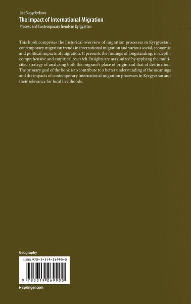 This book comprises the historical overview of migration processes in Kyrgyzstan, contemporary migration trends in international migration and various social, economic and political impacts of migration. It presents the findings of longstanding, in-depth, comprehensive and empirical research. Insights are maximized by applying the multi-sited strategy of analyzing both the migrant's place of origin and that of destination. The primary goal of the book is to contribute to a better understanding of the meanings and the impacts of contemporary international migration processes in Kyrgyzstan and their relevance for local livelihoods.