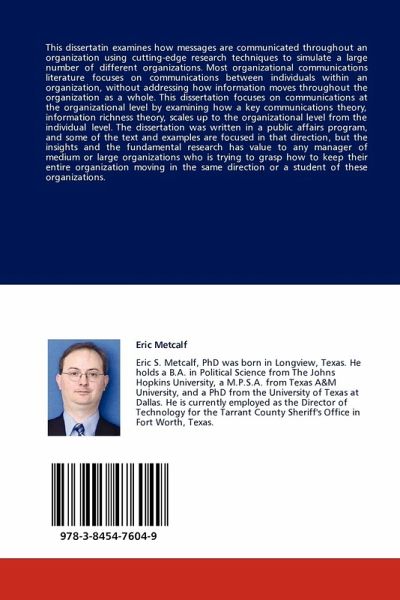 This dissertatin examines how messages are communicated throughout an organization using cutting-edge research techniques to simulate a large number of different organizations. Most organizational communications literature focuses on communications between individuals within an organization, without addressing how information moves throughout the organization as a whole. This dissertation focuses on communications at the organizational level by examining how a key communications theory, information richness theory, scales up to the organizational level from the individual level. The dissertation was written in a public affairs program, and some of the text and examples are focused in that direction, but the insights and the fundamental research has value to any manager of medium or large organizations who is trying to grasp how to keep their entire organization moving in the same direction or a student of these organizations.