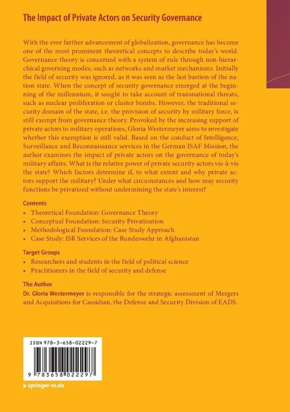 With the ever farther advancement of globalization, governance has become one of the most prominent theoretical concepts to describe today's world. Governance theory is concerned with a system of rule through non-hierarchical governing modes, such as networks and market mechanisms. Initially the field of security was ignored, as it was seen as the last bastion of the nation state. When the concept of security governance emerged at the beginning of the millennium, it sought to take account of transnational threats, such as nuclear proliferation or cluster bombs. However, the traditional security domain of the state, i.e. the provision of security by military force, is still exempt from governance theory. Provoked by the increasing support of private actors to military operations, Gloria Westermeyer aims to investigate whether this exemption is still valid. Based on the conduct of Intelligence, Surveillance and Reconnaissance services in the German ISAF Mission, the author examinesthe impact of private actors on the governance of today's military affairs. What is the relative power of private security actors vis-à-vis the state? Which factors determine if, to what extent and why private actors support the military? Under what circumstances and how may security functions be privatized without undermining the state's interest?