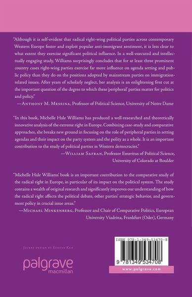'Although it is self-evident that radical right-wing political parties across contemporary Western Europe foster and exploit popular anti-immigrant sentiment, it is less clear to what extent they exercise significant political influence. In a well-executed and intellectually engaging study, Williams surprisingly concludes that for at least three prominent country cases right-wing parties exercise far more influence on agenda setting and public policy than they do on the positions adopted by mainstream parties on immigration-related issues. After years of scholarly neglect, her analysis is an enlightening first cut at the important question of the degree to which these 'peripheral' parties matter for politics and policy.' - Anthony M. Messina, Professor of Political Science, University of Notre Dame"In this book, Michelle Williams has produced a well-researched and theoretically innovative analysis of the extreme right in Europe. Combining case-study and comparative approaches, she breaks new ground in focusing on the role of peripheral parties in agenda setting and their impact on the party system and the polity as a whole. It is an important contribution to the study of political parties in Western democracies." - William Safran, University of Colorado at Boulder"Michelle Hale Williams' book is an important contribution to the comparative study of the radical right in Europe, in particular of its impact on the political system. The study contains a wealth of original research and significantly improves our understanding of how the radical right affects the political debate, other parties' strategic behaviour and government policy in crucial issue areas." - Professor Michael Minkenberg, Chair of Comparative Politics, European University Viadrina, Frankfurt (Oder), Germany