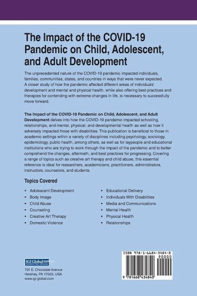 The unprecedented nature of the COVID-19 pandemic impacted individuals, families, communities, states, and countries in ways that were never expected. A closer study of how the pandemic affected different areas of individuals' development and mental and physical health, while also offering best practices and therapies for contending with extreme changes in life, is necessary to successfully move forward. The Impact of the COVID-19 Pandemic on Child, Adolescent, and Adult Development delves into how the COVID-19 pandemic impacted schooling, relationships, and mental, physical, and developmental health as well as how it adversely impacted those with disabilities. This publication is beneficial to those in academic settings within a variety of disciplines including psychology, sociology, epidemiology, public health, among others, as well as for laypeople and educational institutions who are trying to work through the impact of the pandemic and to better comprehend the changes, aftermath, and best practices for progressing. Covering a range of topics such as creative art therapy and child abuse, this essential reference is ideal for researchers, academicians, practitioners, administrators, instructors, counselors, and students.
