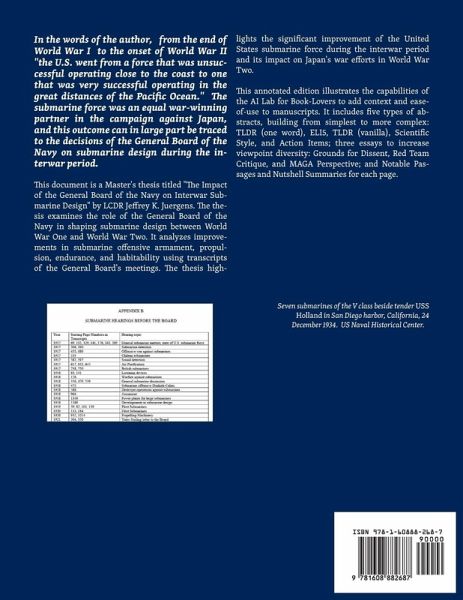 In the words of the author, from the end of World War I to the onset of World War II ""the U.S. went from a force that was unsuccessful operating close to the coast to one that was very successful operating in the great distances of the Pacific Ocean."" The submarine force was an equal war-winning partner in the campaign against Japan, and this outcome can in large part be traced to the decisions of the General Board of the Navy on submarine design during the interwar period. This document is a Master's thesis titled ""The Impact of the General Board of the Navy on Interwar Submarine Design"" by LCDR Jeffrey K. Juergens. The thesis examines the role of the General Board of the Navy in shaping submarine design between World War One and World War Two. It analyzes improvements in submarine offensive armament, propulsion, endurance, and habitability using transcripts of the General Board's meetings. The thesis highlights the significant improvement of the United States submarine force during the interwar period and its impact on Japan's war efforts in World War Two. This annotated edition illustrates the capabilities of the AI Lab for Book-Lovers to add context and ease-of-use to manuscripts. It includes five types of abstracts, building from simplest to more complex: TLDR (one word), ELI5, TLDR (vanilla), Scientific Style, and Action Items; three essays to increase viewpoint diversity: Grounds for Dissent, Red Team Critique, and MAGA Perspective; and Notable Passages and Nutshell Summaries for each page.