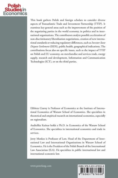 This book gathers Polish and foreign scholars to consider diverse aspects of Transatlantic Trade and Investment Partnership (TTIP). It examines key general areas such as the improvement of the position of the negotiating parties in the world economy, in politics and in international organisations. The contributors analyze possible acceleration of non-discriminatory liberalisation negotiations, creation of new international standards or reducing regulatory differences, such as «Investor-state dispute settlement» (ISDS), public health, geographical indications. The contributions focus also on specific issues, such as the impact of TTIP on Polish and EU economy, on merchandise and services trade, energy supply, research and development, Information and Communication Technologies (ICT), or on the third parties.