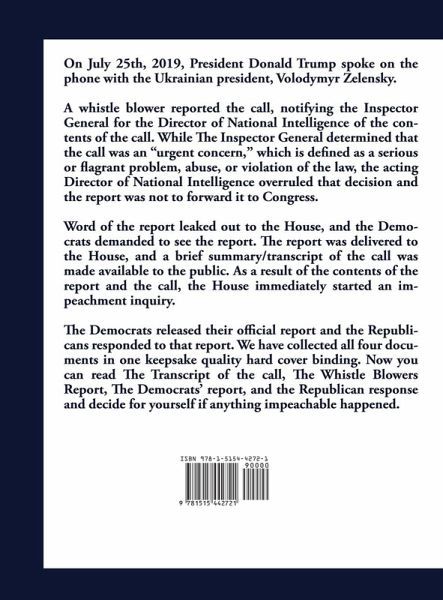 On July 25th, 2019, President Donald Trump spoke on the phone with the Ukrainian president, Volodymyr Zelensky. A whistle blower reported the call, notifying the Inspector General for the Director of National Intelligence of the contents of the call. While The Inspector General determined that the call was an "urgent concern," which is defined as a serious or flagrant problem, abuse, or violation of the law, the acting Director of National Intelligence overruled that decision and the report was not to forward it to Congress. Word of the report leaked out to the House, and the Democrats demanded to see the report. The report was delivered to the House, and a brief summary/transcript of the call was made available to the public. As a result of the contents of the report and the call, the House immediately started an impeachment inquiry. The Democrats released their official report and the Republicans responded to that report. We have collected all four documents in one keepsake quality hard cover binding. Now you can read The Transcript of the call, The Whistle Blowers Report, The Democrats’ report, and the Republican response and decide for yourself if anything impeachable happened.