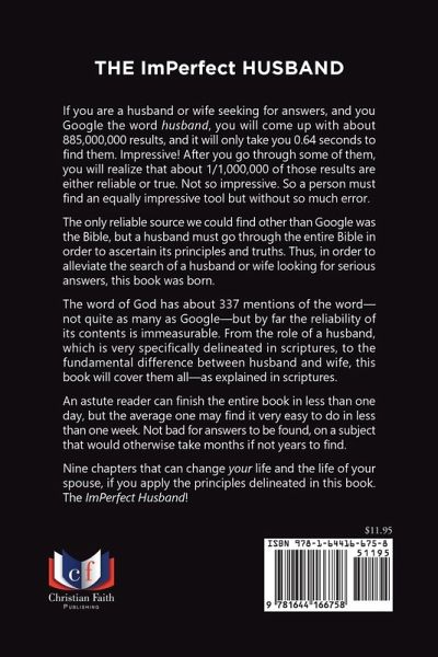 If you are a husband or wife seeking for answers, and you Google the word husband, you will come up with about 885,000,000 results, and it will only take you 0.64 seconds to find them. Impressive! After you go through some of them, you will realize that about 1/1,000,000 of those results are either reliable or true. Not so impressive. So a person must find an equally impressive tool but without so much error. The only reliable source we could find other than Google was the Bible, but a husband must go through the entire Bible in order to ascertain its principles and truths. Thus, in order to alleviate the search of a husband or wife looking for serious answers, this book was born. The word of God has about 337 mentions of the word--not quite as many as Google--but by far the reliability of its contents is immeasurable. From the role of a husband, which is very specifically delineated in scriptures, to the fundamental difference between husband and wife, this book will cover them all--as explained in scriptures. An astute reader can finish the entire book in less than one day, but the average one may find it very easy to do in less than one week. Not bad for answers to be found, on a subject that would otherwise take months if not years to find. Nine chapters that can change your life and the life of your spouse, if you apply the principles delineated in this book. The Imperfect Husband!