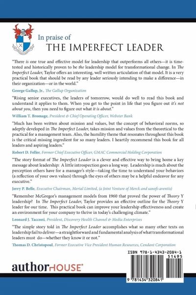 The story told in The Imperfect Leader is timely...it's relevant...it's powerful...and it will challenge the way you think about leadership. It is a story that reveals a new model for transformational leadership-one that flies in the face of conventional wisdom, creates healthy corporate cultures, and delivers extraordinary, sustainable results. It is a story about the personal journey transformational leaders must take in order to be true to themselves-to be in touch with themselves-and to find at journey's end that it's not about them. The Imperfect Leader will resonate with leaders at all levels and in every walk of life. It guides, equips and motivates leaders, young and old, to understand the necessity for personal transformation that is required for leaders to make a difference in their organizations. George Gallup, Jr. (The Gallup Organization) said this about The Imperfect Leader: "There is one true and effective model for leadership that outperforms all others-it is time-tested and historically proven to be the leadership model for transformational change. In The Imperfect Leader, Taylor offers an interesting, well written articulation of that model. It is a very practical book that should be read by any leader seriously intending to make a difference-in their organization-or in the world."