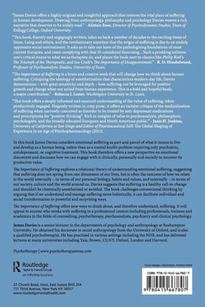 In this book James Davies considers emotional suffering as part and parcel of what it means to live and develop as a human being, rather than as a mental health problem requiring only psychiatric, antidepressant or cognitive treatment. This book therefore offers a new perspective on emotional discontent and discusses how we can engage with it clinically, personally and socially to uncover its productive value. The Importance of Suffering explores a relational theory of understanding emotional suffering suggesting that suffering, does not spring from one dimension of our lives, but is often the outcome of how we relate to the world internally - in terms of our personal biology, habits and values, and externally - in terms of our society, culture and the world around us. Davies suggests that suffering is a healthy call-to-change and shouldn't be chemically anesthetised or avoided. The book challenges conventional thinking by arguing that if we understand and manage suffering more holistically, it can facilitate individual and social transformation in powerful and surprising ways. The Importance of Suffering offers new ways to think about, and therefore understand suffering. It will appeal to anyone who works with suffering in a professional context including professionals, trainees and academics in the fields of counselling, psychotherapy, psychoanalysis, psychiatry and clinical psychology.