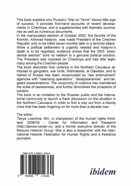 This book explains why Russia's "War on Terror" shows little sign of success. It provides first-hand accounts of recent developments in Chechnya, and is supplemented with thematic summaries as well as numerous documents. In the manipulated election of October 2003, the favorite of the Kremlin, Akhmad Kadyrov, was made President of the Chechen Republic only to be killed seven months later in a terrorist attack. While a political settlement is urgently needed and Kadyrov's death is to be regretted, evidence shows that the 2003 "presidential election" bore no relation to a sincere political solution. The President was imposed on Chechnya and had little legitimacy among the Chechen people. The book describes how violence in the Northern Caucasus attributed to gangsters, war lords, Wahhabists, al Qaedists, and to hatred of Russia has been reciprocated by "law enforcement" agencies with "cleansing operations", "disappearances", and targeted assassinations. The reciprocity of violence has maintained the scale of lawlessness, and further diminished the prospects of solution. The book is an invitation to the Russian public and the international community to launch a frank discussion on the situation in the Northern Caucasus in order to find a way out from a bloody crisis that has been lingering on for more than a decade now.