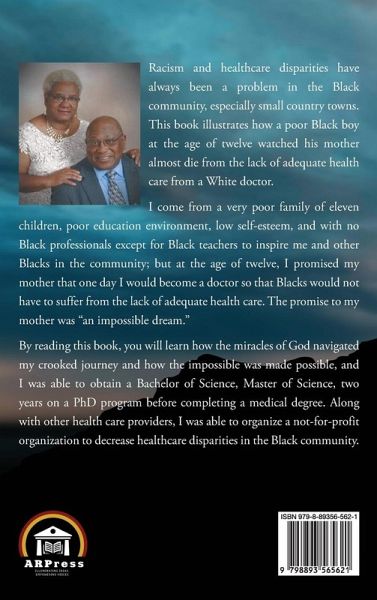 Racism and healthcare disparities have always been a problem in the Black community, especially small country towns. This book illustrates how a poor Black boy at the age of twelve watched his mother almost die from the lack of adequate health care from a White doctor. I come from a very poor family of eleven children, poor education environment, low self-esteem, and with no Black professionals except for Black teachers to inspire me and other Blacks in the community; but at the age of twelve, I promised my mother that one day I would become a doctor so that Blacks would not have to suffer from the lack of adequate health care. The promise to my mother was "an impossible dream." By reading this book, you will learn how the miracles of God navigated my crooked journey and how the impossible was made possible, and I was able to obtain a Bachelor of Science, Master of Science, two years on a PhD program before completing a medical degree. Along with other health care providers, I was able to organize a not-for-profit organization to decrease healthcare disparities in the Black community.