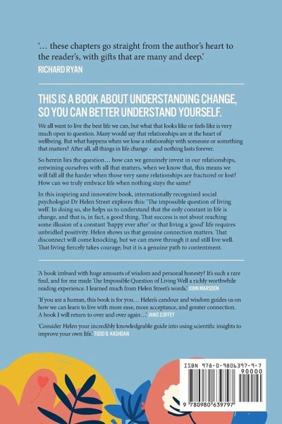 This is a book about understanding change, so you can better understand yourself. We all want to live the best life we can, but what that looks like or feels like is very much open to question. Many would say that relationships are at the heart of wellbeing. But what happens when we lose a relationship with someone or something that matters? After all, all things in life change - and nothing lasts forever. So herein lies the question... how can we genuinely invest in our relationships, entwining ourselves with all that matters, when we know that, this means we will fall all the harder when those very same relationships are fractured or lost? How can we truly embrace life when nothing stays the same? In this inspiring and innovative book, internationally recognised social psychologist Dr Helen Street explores this: 'The impossible question of living well'. In doing so, she helps us to understand that the only constant in life is change, and that is, in fact, a good thing. That success is not about reaching some illusion of a constant 'happy ever after' or that living a 'good' life requires unbridled positivity. Helen shows us that genuine connection matters. That disconnect will come knocking, but we can move through it and still live well. That living fiercely takes courage; but it is a genuine path to contentment.