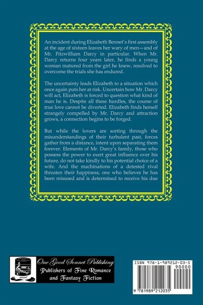 An incident during Elizabeth Bennet’s first assembly at the age of sixteen leaves her wary of men—and of Mr. Fitzwilliam Darcy in particular. When Mr. Darcy returns four years later, he finds a young woman matured from the girl he knew, resolved to overcome the trials she has endured. The uncertainty leads Elizabeth to a situation which once again puts her at risk. Uncertain how Mr. Darcy will act, Elizabeth is forced to question what kind of man he is. Despite all these hurdles, the course of true love cannot be diverted. Elizabeth finds herself strangely compelled by Mr. Darcy and attraction grows, a connection begins to be forged. But while the lovers are sorting through the misunderstandings of their turbulent past, forces gather from a distance, intent upon separating them forever. Elements of Mr. Darcy’s family, those who possess the power to exert great influence over his future, do not take kindly to his potential choice of a wife. And the machinations of a detested rival threaten their happiness, one who believes he has been misused and is determined to receive his due no matter what the cost.