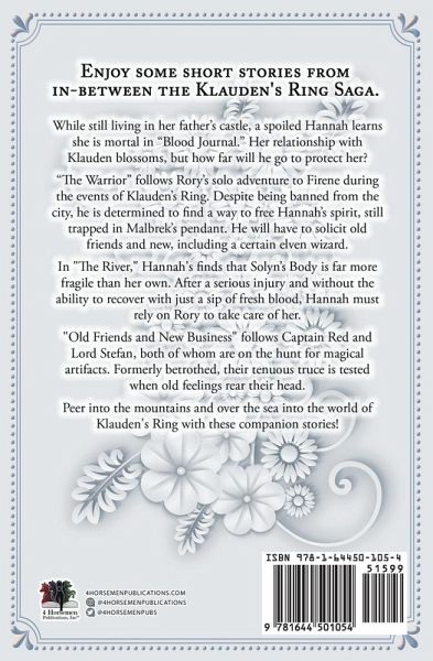 Enjoy some stories from in-between the Klauden's Ring Saga. "Blood Journal" shows the reason why Hannah has to leave her father's castle. "The Warrior" tells what happened when Rory went to Firene during the events of Klauden's Ring. "The River" explores Hannah's adjustment to her new body in this story before Solyn's Body. "Old Friends and New Business" introduces new characters who appear in Hannah's Heart.