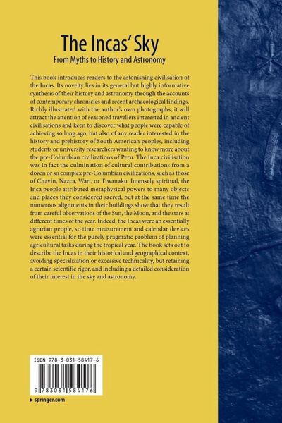 This book introduces readers to the astonishing civilisation of the Incas. Its novelty lies in its general but highly informative synthesis of their history and astronomy through the accounts of contemporary chronicles and recent archaeological findings. Richly illustrated with the author's own photographs, it will attract the attention of seasoned travellers interested in ancient civilisations and keen to discover what people were capable of achieving so long ago, but also any reader interested in the history and prehistory of South American peoples, including students or university researchers wanting to know more about the pre-Columbian civilizations of Peru. The Inca civilisation was in fact the culmination of cultural contributions from a dozen or so complex pre-Columbian civilizations, such as those of Chavín, Nazca, Wari, or Tiwanaku. Intensely spiritual, the Inca people attributed metaphysical powers to all manner of objects and places they considered sacred, but at the same time the numerous alignments in their buildings show that they result from careful observations of the Sun, the Moon, and the stars at different times of the year. Indeed, the Incas were an essentially agrarian people, so time measurement and calendar devices were essential for the purely pragmatic problem of planning agricultural tasks during the tropical year. The book sets out to describe the Incas in their historical and geographical context, avoiding specialization or excessive technicality, but retaining a certain scientific rigor, and including a detailed consideration of their interest in the sky and astronomy.