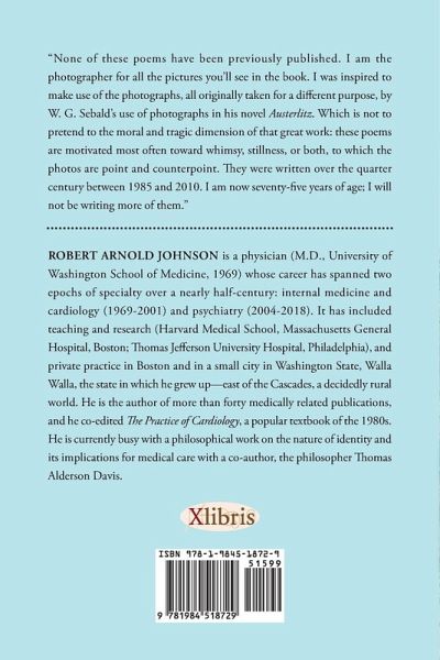 None of these poems have been previously published. I am the photographer for all the pictures you'll see in the book. I was inspired to make use of the photographs, all originally taken for a different purpose, by W. G. Sebald's use of photographs in his novel Austerlitz. Which is not to pretend to the moral and tragic dimension of that great work: these poems are motivated most often toward whimsy, stillness, or both, to which the photos are point and counterpoint. They were written over the quarter century between 1985 and 2010. I am now seventy-five years of age; I will not be writing more of them.
