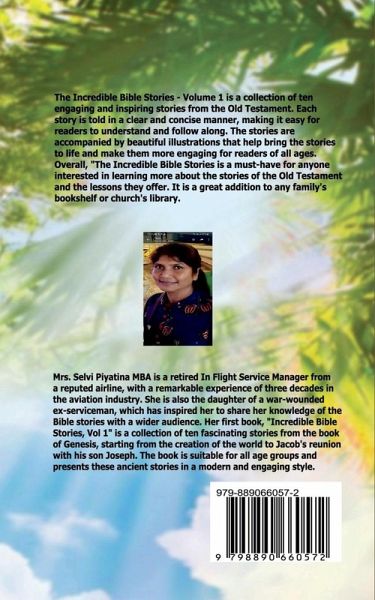 The Incredible Bible Stories - Volume 1 is a collection of ten engaging and inspiring stories from the Old Testament. Each story is told in a clear and concise manner, making it easy for readers to understand and follow along. The stories are accompanied by beautiful illustrations that help bring the stories to life and make them more engaging for readers of all ages. Overall, "The Incredible Bible Stories is a must-have for anyone interested in learning more about the stories of the Old Testament and the lessons they offer. It is a great addition to any family's bookshelf or church's library.