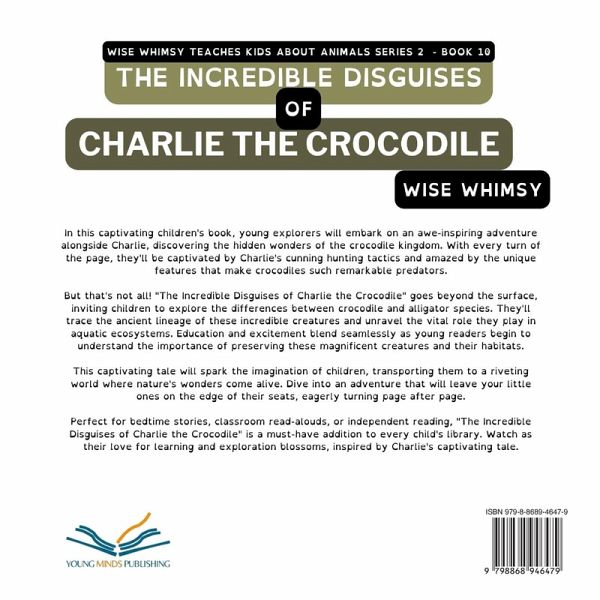 Introducing "The Incredible Disguises of Charlie the Crocodile" - an enchanting journey into the mysterious world of crocodiles, tailor-made for curious young minds aged 3 to 8. Get ready to dive into the murky waters of rivers, where Charlie the Crocodile unravels the secrets of stealth, camouflage, and the captivating world of these magnificent creatures! In this captivating children's book, young explorers will embark on an awe-inspiring adventure alongside Charlie, discovering the hidden wonders of the crocodile kingdom. With every turn of the page, they'll be captivated by Charlie's…mehr