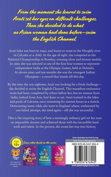 Arati Saha was born in 1940, and learnt to swim in the Hooghly river in Calcutta as a child. At the age of eight, she competed in the National Championship in Bombay, winning silver and bronze medals. When she was eleven years and ten months, she was selected as one of the first four women to represent independent India at the Helsinki Summer Olympics of 1952. She was the youngest Indian Olympian-a record that stands till this day. By the time she was eighteen, Arati was looking for a fresh challenge-she decided to swim the English Channel. This marathon endurance swim had been completed by others before her, but no woman from India, indeed from Asia, had done so yet. Arati trained in the lakes and pools of Calcutta, once swimming for sixteen hours at a stretch. Overcoming many odds, she went to England where, undaunted by one failed attempt, she tried again-till she was successful. This is the inspiring story of how a seemingly ordinary girl set her eyes on impossible dreams and achieved them with her incredible hard work and talent. In the process, she swam her way into history.