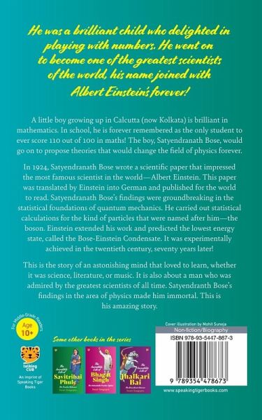 A little boy growing up in Calcutta (now Kolkata) is brilliant in mathematics. In school, he is forever remembered as the only student to ever score 110 out of 100 in maths! The boy, Satyendranath Bose, would go on to propose theories that would change the fi eld of physics forever. In 1924, Satyendranath Bose wrote a scientifi c paper that impressed the most famous scientist in the world-Albert Einstein. This paper was translated by Einstein into German and published for the world to read. Satyendranath Bose's fi ndings were groundbreaking in the statistical foundations of quantum mechanics. He carried out statistical calculations for the kind of particles that were named after him-the boson. Einstein extended his work and predicted the lowest energy state, called the Bose-Einstein Condensate. It was experimentally achieved in the twentieth century, seventy years later! This is the story of an astonishing mind that loved to learn, whether it was science, literature, or music. It is also about a man who was admired by the greatest scientists of all time. Satyendranth Bose's fi ndings in the area of physics made him immortal. This is his amazing story.
