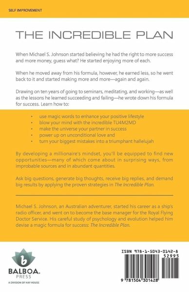When Michael S. Johnson started believing he had the right to more success and more money, guess what? He started enjoying more of each. When he moved away from his formula, however, he earned less, so he went back to it and started making more and more-again and again. Drawing on ten years of going to seminars, meditating, and working-as well as the lessons he learned succeeding and failing-he wrote down his formula for success. Learn how to: ¿ use magic words to enhance your positive lifestyle ¿ blow your mind with the incredible TU4M2MD ¿ make the universe your partner in success ¿ power up on unconditional love and ¿ turn your biggest mistakes into a triumphant hallelujah By developing a millionaire's mindset, you'll be equipped to find new opportunities-many of which come about in surprising ways, from improbable sources and in abundant quantities. Ask big questions, generate big thoughts, receive big replies, and demand big results by applying the proven strategies in The Incredible Plan.