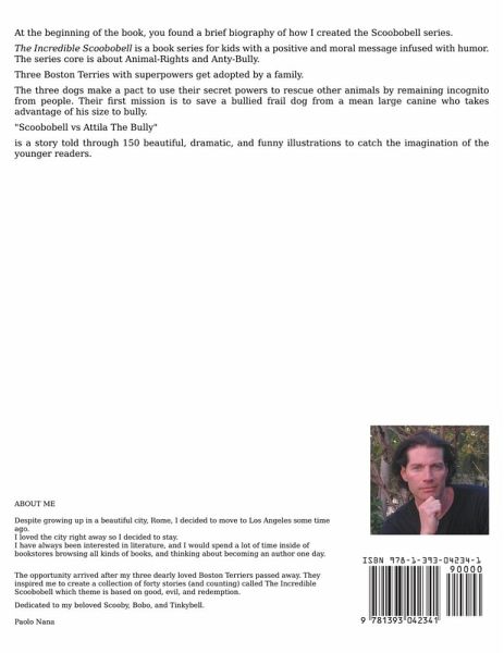 The Incredibles Scoobobell is a cartoon series with a positive and moral message infused with humor. The main characters are three adopted dogs with secret superpowers. At night, they go around the city on a mission to protect animals in danger, and sometimes people too. In this first story, the super trio goes on a mission to teach a lesson to Attila, a large mean dog who enjoys bullying dogs smaller than him. "Scoobobell vs Attila the Bully" is a story told through 150 beautiful, dramatic, and funny illustrations to catch the imagination of the younger readers. At the beginning of the book, you find the true story titled " How Everything Started" This intro is about how I ended up owning three Boston terriers, and how they inspired me to write the book series "The Incredibles Scoobobell" The 20 drawings-intro is a brief biography is packed with sweet and emotional feelings, especially for all of you who love their pets.