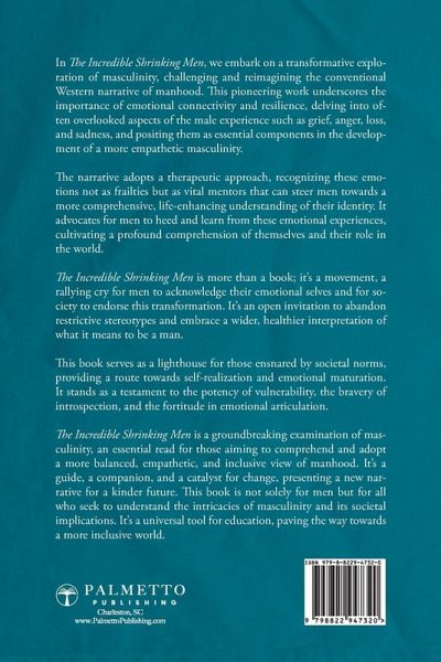 Revolutionizing Masculinity: A Compassionate Guide for Men Embracing Emotions, Grief, and Loss. A Must-Read For All Seeking a Healthier, More Inclusive Vision of Masculinity. In The Incredible Shrinking Men, we delve into a transformative journey of redefining masculinity. This groundbreaking narrative challenges the traditional Western concept of manhood, offering a fresh perspective that fosters emotional connectivity and resilience. The book explores the often-ignored facets of the male experience, such as grief, anger, loss, and sadness, and positions them as crucial elements in the evolution of a more compassionate masculinity. The narrative takes a healing approach, viewing these emotions not as weaknesses but as essential teachers that can guide men towards a more inclusive and life-affirming vision of their identity. It encourages men to listen and learn from these emotional experiences, fostering a deeper understanding of themselves and their place in the world. The Incredible Shrinking Men is not just a book; it's a movement, a call to action for men to embrace their emotional selves and for society to support this change. It is an invitation to step away from the confining stereotypes and to welcome a broader, healthier concept of what it means to be a man. This book is a beacon of hope for those feeling trapped by societal expectations, offering a path towards self-discovery and emotional growth. It is a testament to the power of vulnerability, the courage of self-reflection, introspection and the strength in emotional expression. The Incredible Shrinking Men is a revolutionary exploration of masculinity, a must-read for those seeking to understand and embrace a more balanced, empathetic, and inclusive vision of manhood. It is a guide, a companion, and a catalyst for change, offering a new narrative for a more compassionate future. This book is not just for men but for anyone interested in understanding the complexities of masculinity and its impact on society. It's a book for everyone, a tool for education, and a steppingstone towards a more inclusive world.