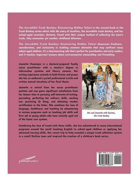 The Incredible Trash Donkey: Discovering Hidden Talent is the second book in the Trash Donkey series which tells the story of Josefina, the incredible trash donkey, and her school-aged caretaker, Antonio. Faced with their unique method of collecting the town's trash, they encounter yet another childhood dilemma. The Incredible Trash Donkey: Discovering Hidden Talent showcases kindness, consideration and inclusivity, in tackling common obstacles that may confront many school-aged children. It's a heartwarming tale that's perfect for preschoolers and early readers, and it teaches important lessons about environmental stewardship and friendship.