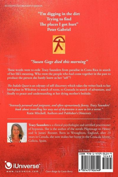 "I'm digging in the dirt Trying to find The places I got hurt" Peter Gabriel "Susan Gage died this morning" These words were to exile Tracy Saunders from paradise in Costa Rica in search of her life's meaning. Who were the people who had come together in the past to produce the person she barely knew as her "self "? The Indalo Quest is an odyssey of self-discovery which takes the writer back to her birthplace in Wiltshire in search of roots, to Granada in search of adventure, and finally to peace and understanding at her dying mother's bedside. "Intensely personal and poignant, and often uproariously funny, Tracy Saunders' book about travelling her way out of depression is sure to hit a nerve." Katie Mitchell, Authors and Publisher's Directory