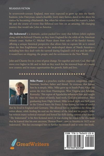 RELIGIOUS FICTIONIn seventeenth-century England, men were expected to grow up into the family business. John Dairyman, raised a humble, lowly dairy farmer, dared to rise above his station by becoming a blacksmith. But when his talents exceeded his master's, John's life and the course of events that followed sent him on an amazing, life-changing journey that would take John to America.The Indentured is a dramatic, action-packed love story that follows John's exploits along with his beloved Chastity as they leave England for the wilds of the American Atlantic coast. Author C. Michael Prater draws from tales of his family's history, offering a unique historical perspective that allows him to capture life as it existed when the first Englishmen came to the undeveloped shores of North America- including how they dealt with the turmoil during England's civil war and the effects it would have on shipping, the people, and the settlements in the New World.John and Chastity live in a time of great change. Yet together and with God, they will move ever higher in life and in faith as they reach for the renewed hope of a young new country and its many opportunities for growth, faith and love.