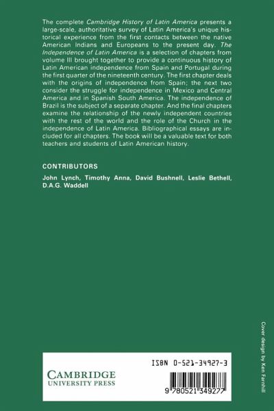 The Independence of Latin America is a selection of chapters from the Cambridge History of Latin America Volume 3. The first chapter deals with the origins of independence from Spain; the next two consider the struggle for independence in Mexico and Central America and in Spanish South America. The independence of Brazil is discussed in a separate chapter, while the final chapters examine the relationship of the newly independent countries with the rest of the world and the role of the Church in the independence of Latin America.