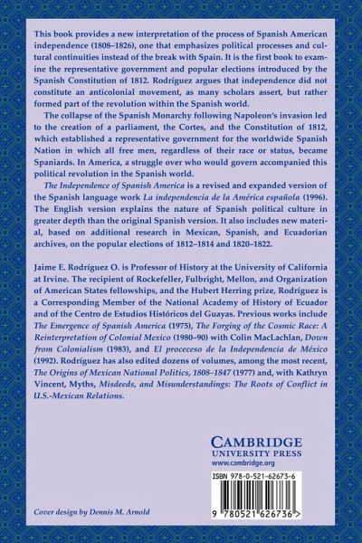 The author provides a new interpretation of the process of Spanish American independence (1808-1826); one that emphasizes political processes and cultural continuities, instead of the break with Spain. He examines the representative government and popular elections of 1812 and argues that independence did not constitute an anticolonial movement, as many scholars assert, but rather formed part of the broader Spanish political revolution.