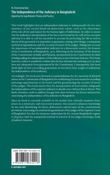 Since no book is currently available in the market that critically examines these issues in a systematic and structured manner, this research enhances knowledge by not only identifying the flaws,deficiencies and lacunae of the constitutional provisions concerning the method of appointment of the judges of the Supreme Court of Bangladesh but also the measures undertaken by the current Bangladeshi regime to dispense with the transparent method of removal of the judges involving a body of judicial character.